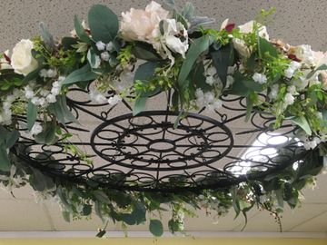 Remote controlled warm lighting woven into the floral decor. Hanging jewels can be added for additional cost.