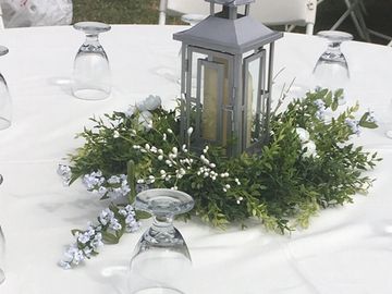 Silver great as a centerpiece accent or as a lantern on a shepherds hook at the end of the bench or aisle.